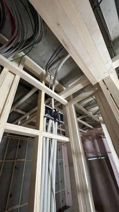 快適な住空間を創り出す、天井裏の神経網:内装工事が進み、天井や壁の骨格となる木製の下地が組まれた状態の天井裏から、照明器具、スイッチ、コンセント、換気扇、インターネット回線などに繋がる全ての電気配線を、設計図通りに配置していきます。